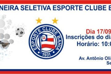 Esporte Clube Bahia busca talentos do futebol em Sete Lagoas Redacao Ultima Notícia 8 de setembro de 2016 Cultura, Notícias Seletiva será realizada no dia 17 de setembro no Campo do Bela Vista Com objetivo de revelar novos talentos do futebol, o Esporte Clube Bahia marcou a data para a seletiva de atletas em Sete Lagoas. No d... Leia mais...