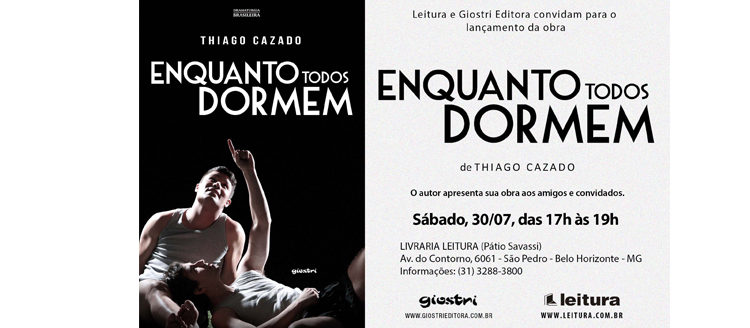 Em cartaz com o espetáculo “Enquanto Todos Dormem”, ator Thiago Cazado lança livro sobre a peça em Belo Horizonte Redacao Ultima Notícia 20 de julho de 2016 Cultura, Notícias Devido ao grande sucesso que o espetáculo está conquistando por onde passa, a Giostri Editora e o ator Thiago Cazado decidiram produzir um livro com o texto e fotos da montagem. Em Belo Horizonte, o lançamento será no sábado, 30 de agosto, de 17h às 19h, com uma sessão de autógrafos de Thiago Cazado na Livraria Leitura do Pátio Savassi (Av. Contorno, 6061, Savassi). No espetáculo, Pedro Andrade e Luíz Gustavo Silva, soldados do exército, são convocados para um treinamento em local distante de onde moram. Longe de suas famílias e confinados em um ambiente hostil, eles compartilham suas angústias e a expectativa de um combate iminente. Em contraponto à tensão, surge a cumplicidade, o respeito e a admiração entre os dois jovens, afeição que os leva a viverem aventuras íntimas. Sobre o roteiro do espetáculo Cenografia e sonoplastia transformam o palco em uma base militar do ano de 1938, localizada no Peru. Ao longo dos sessenta minutos de espetáculo, as lembranças vividas por Pedro, ao lado de seu parceiro, Luíz, são trazidas à cena. Através dos diálogos, entremeados de contrastes, é revelada a instigante amizade entre dois rapazes que se transforma em um romance explosivo. “Isto porque se trata da vida de dois garotos cheios de sonhos, inseridos em um contexto nada favorável”, explana Thiago Cazado, que assina o 10° texto de sua carreira. A angústia velada se esvai nos momentos de descontração entre os dois, “válvula de escape para os dias duros e que faz as personagens se unirem, como se um encontrasse no outro um motivo bom para estar ali”, conta o autor. Pedro, a personagem central da trama, é tímido e reservado. Ele desenvolve por Luíz uma admiração e o toma quase como um ídolo, pois é Luíz quem o apresenta a um mundo de liberdade e adrenalina, com pitadas de provocação sexual. Tal comportamento de Luiz leva Pedro a enxergá-lo como um “oponente desafiando sua libido”. A dramaturgia, com diálogos ágeis e iluminada por imagens contemplativas, utiliza-se de códigos teatrais inusitados para dar solução a alguns elementos trazidos à cena. Exemplos disso são os sons de animais que retratam as personagens que não aparecem fisicamente no palco ou a utilização da expressão corporal e da trilha sonora para transportar o publico para cenários como uma cachoeira. “É o que faz do teatro, o teatro”, acredita Cazado. Sobre a MACA Entretenimento: Este é o segundo espetáculo com temática envolvendo a diversidade sexual produzido pela MACA entretenimento. A produtora também é envolvida em produções cinematográficas e já reúne mais de 700 mil views no youtube. Em março de 2016, por exemplo, a MACA produziu o filme curta metragem “Tenho Local”, já com mais de 250 mil views em dois meses de publicação. O filme irá virar um longa metragem, com roteiro já pronto e que será gravado no final deste ano. Ficha Técnica: Texto e direção: Thiago Cazado Elenco: Renan Mendes e Thiago Cazado Assistente de direção: Luiza Pomar Produção: Marina Falcão Produtor associado: Mauro Carvalho Cenografia: Armando Araújo Iluminação: Ludmila Maria Trilha sonora: Joaquim Menezes Contra-regra: Maria Soares Fotografia: Marcus Valderato Realização: Maca Entretenimento Serviço: Espetáculo Enquanto Todos Dormem Datas: 29 a 31 de julho, sexta a domingo Horários: Sexta e sábado às 21h | Domingo às 20h Local: Teatro de Câmara do Cine Theatro Brasil Av. Amazonas, 315 – Centro, Belo Horizonte – MG, 30180-000 Ingressos: R$ 40 (inteira) e R$ 20 (meia) * pagam meia entrada: estudantes; professores da rede pública de ensino; menores de 21 anos; pessoas maiores de 65 anos; e pessoas munidas de panfleto (é possível imprimir o panfleto na página da peça: www.facebook.com.br/macaentretenimento). Vendas: Online pelo site www.compreingressos.com.br ou na bilheteria do teatro. Classificação indicativa: 16 anos. Mais informações na bilheteria: (31) 3201 5211 ou (31) 3243 1964 Lançamento do livro Enquanto Todos Dormem e sessão de autógrafos com o ator Thiago Cazado Data: 30 de julho, sábado Horário: 17h às 19h Local: Livraria Leitura do Pátio Savassi – Av. Contorno, 6061, Savassi Entrada franca comentários