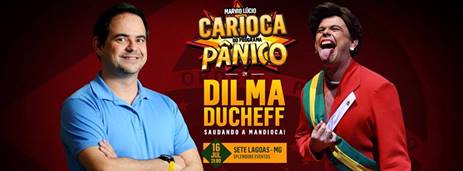 Márvio Lúcio apresenta o espetáculo “Dilma Ducheff: Saudando a Mandioca” em Sete Lagoas Redacao Ultima Notícia 7 de julho de 2016 Cultura, Notícias O Carioca, do programa Pânico, promete uma noite de risos no dia 16 de julho Considerado pelo público como um dos melhores humoristas e imitadores da atualidade, Márvio Lúcio, o Carioca do programa Pânico, faz sua estreia no teatro com o espetáculo “Dilma Ducheff: Saudando a Mandioca”. E Sete Lagoas já tem data marcada para receber a apresentação: no sábado, 16 de julho, a partir das 21h, o espaço de eventos Splendore (Av. Professor Abeylard, 4190, Bairro JK, Sete Lagoas) será palco para o riso. Está na hora do impeachment do mau humor! Após o grande sucesso na televisão, chegou a vez de Márvio Lúcio brilhar nos palcos. Pela primeira vez, Sete Lagoas vai ter um encontro exclusivo com a figura mais ilustre no cenário político brasileiro. Como deve ser a vida de um presidente? Será que os brasileiros sabem realmente o que acontece no Palácio do Planalto? Prepare-se para uma comédia de proporções democráticas, com muita irreverência e tiradas sobre o atual momento político do país. Mais conhecido como Carioca, Márvio Lúcio é humorista, radialista e ator. Além de trabalhar na rede Jovem Pan, onde é apresentador, também faz parte do elenco do programa “Pânico” na Rede Bandeirantes. Tornou-se popular graças as suas inúmeras e emblemáticas imitações. Entre elas, destaque para o Jô Suado, uma sátira ao apresentador Jô Soares, Amaury Dumbo, imitação fiel do apresentador Amaury Junior e mais recentemente Bóris Casoy, vítima de Carioca no “Jornal Do Bóris”, entre muitos outros. Serviço: Espetáculo Dilma Ducheff: Saudando a Mandioca Data: 16 de julho, sábado Horário: 21h Local: Splendore (Av. Professor Abeylard, 4190, Bairro JK, Sete Lagoas) Ingressos: R$ 45,00 Pontos de venda: Central dos Eventos – www.centraldoseventos.com.br Shot Music Bar – Rua Dr. Pena, 156, Centro, Sete Lagoas TPeguei Point Bar – R. Ricarti Normand, 285 – São Geraldo, Sete Lagoas Classificação indicativa: 12 anos Mais informações: https://www.facebook.com/events/1565144190446884/ comentários